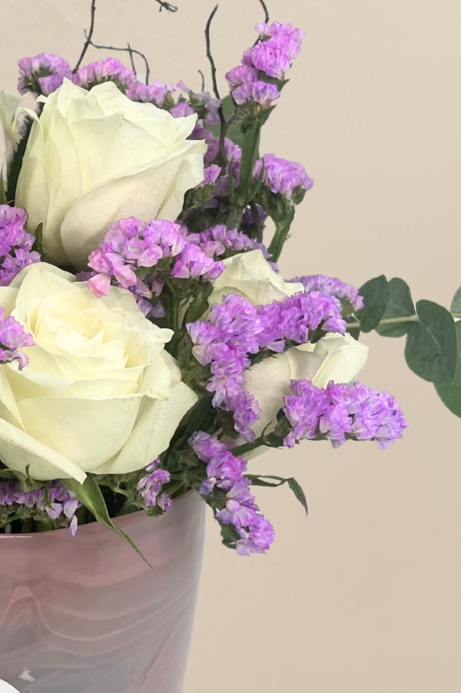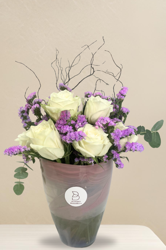جاي على بالكم تشترون ورد ابيض احييكم اختياركم موفق وذوقكم حلو ويسلام لو الورد بفازة انيقة مكس ما بين الكلاسيك والمودرن فازة ورد ابيض مخصصة لتلك الورود الجميلة لتضعيها وين ماتبى فى ايه مكان فى منزلك او هدية رقيقة هالحين سوينالك هالفازة بتنسيق الورد زهور الجوري البيضاء والستاتيس البنفسجية، مانريد منك الا العافية اولا وثانيا ترسلنا الفازة للحجز وحدد موعد وصولها نقدم لكم خدمة توصيل سريعة مقدمة من بلوميد.