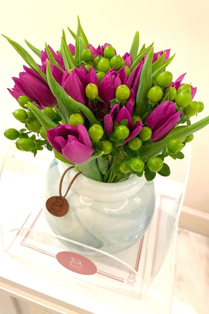 تتميز هذه الفازة السيراميكية المموجة بلونها الأزرق الفاتح، حيث تحتضن أزهار التوليب البنفسجية الرائعة، مما يجعلها قطعة فنية مثالية لأي مكان.