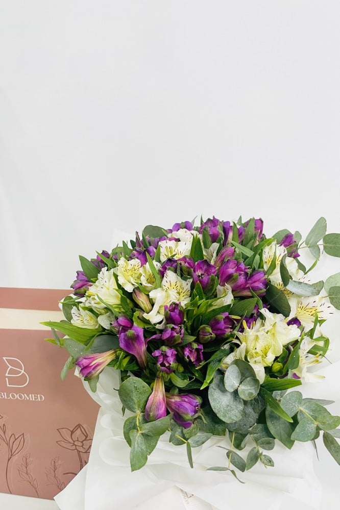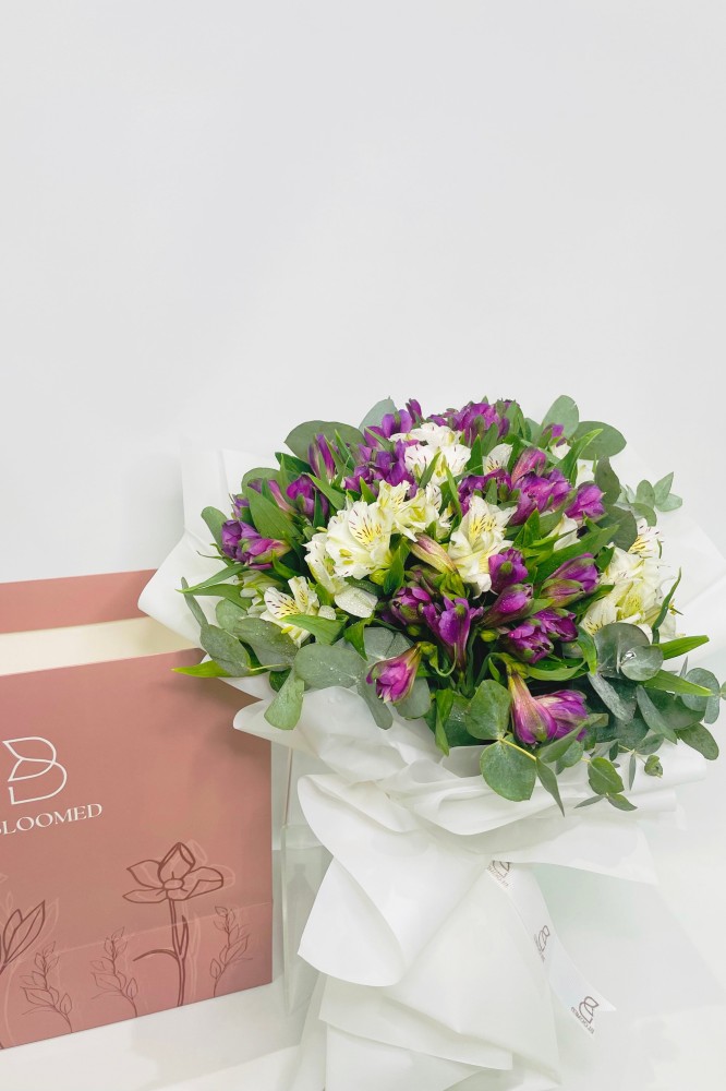 باقة الستروميريا البنفسجي والابيض في صندوق بلومد المميز 💐هدية رائعة لأحبابك( الارتفاع مع الورد 45 سم العرض 30 سم )
