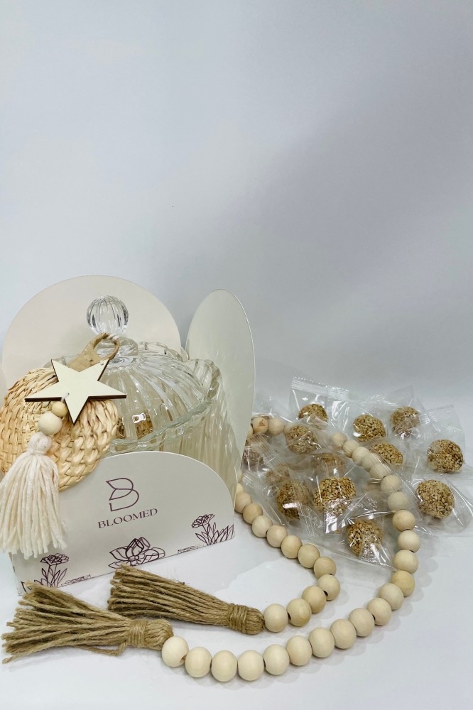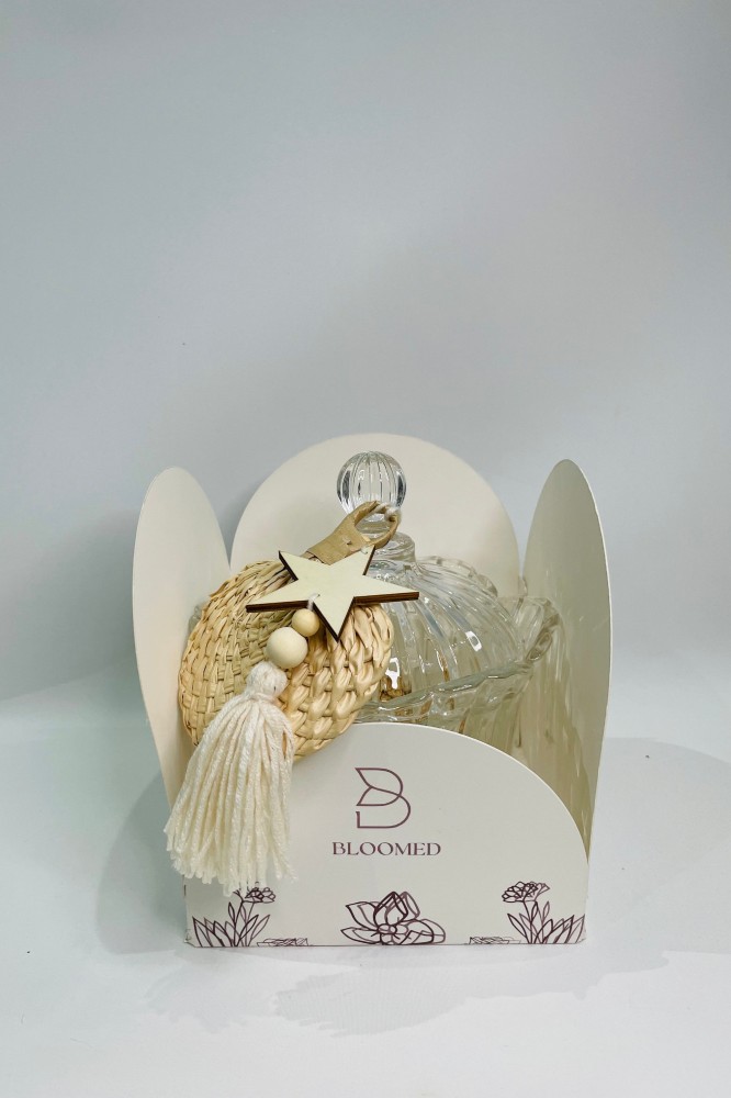 علبة انيقة من بلومد بداخلها فازة كريستالية ( ممكن تعبئتها )مزينة بديكورات رمضانيةعرض القاعدة ١٧ سمالارتفاع الكلي ٢٠ سم