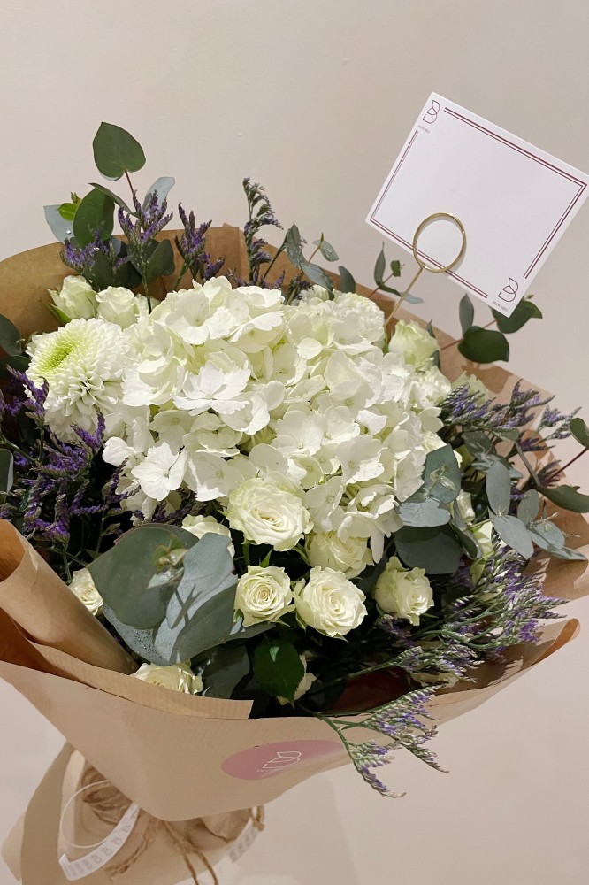 تأخذك باقة ورد أبيض من بلوميد في رحلة عبر عالم من الأناقة الخالدة، حيث يلتقي الأبيض النقي مع لمسات من البنفسجي الساحر.