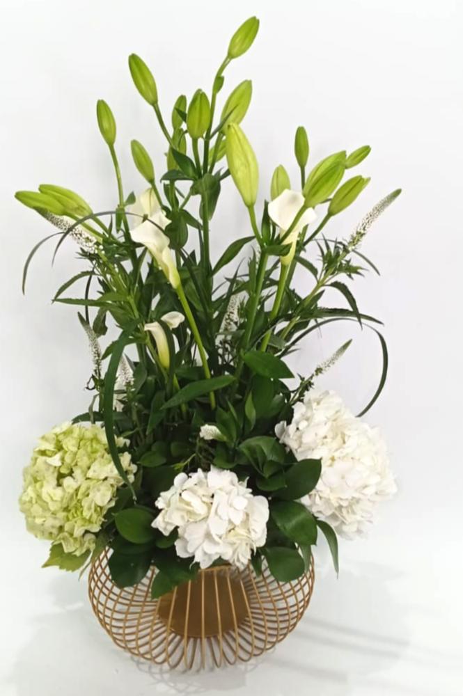 فازة انيقة باللون الذهبي مع لمسات انيقه من ورد الكازابلاكا الابيض وورد الهايدرنجا الانيق 🍀