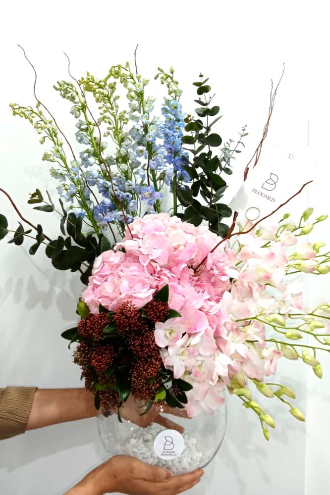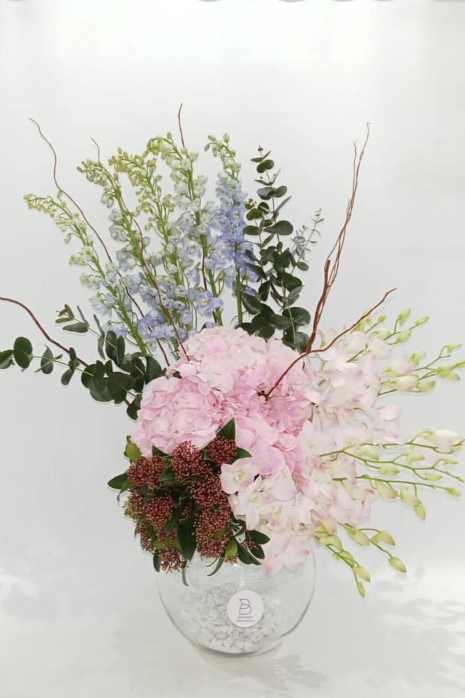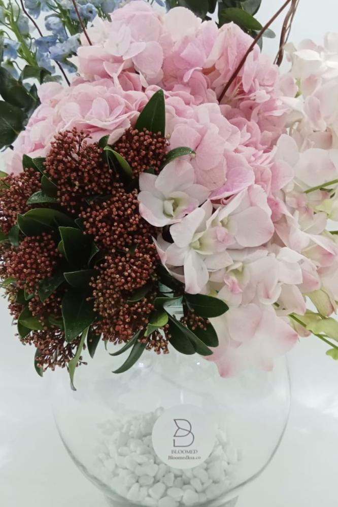 فازة منسقة بعناية من ورد الاوركيد مع لمسات انيقه من ورد الهايدرنجا والدلفينيوم 🪻