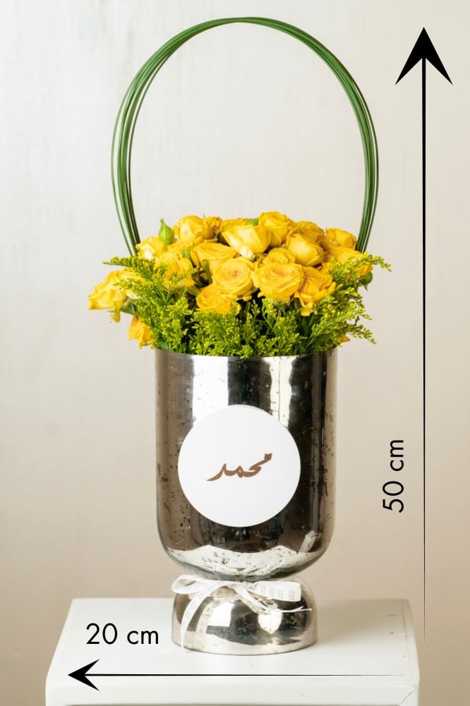 - الأبعاد: ارتفاع الفازة مع باقة ورد اصفر يصل إلى 50 سم، مما يجعلها مثالية لعرضها على الطاولات أو الرفوف، وعرضها 20 سم يضمن استقرارها وجاذبيتها.