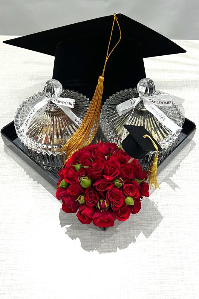 هدية انيقة لكل خريج وخريجة 🎓باقة بيبي روز بالوان متعددةمع علبتين من الكريستال بخيارات تعبئة ( شكولاته او حلويات شرقية )
