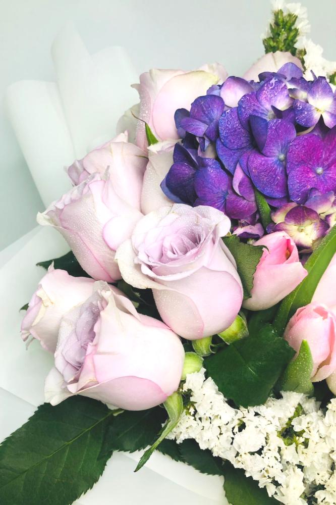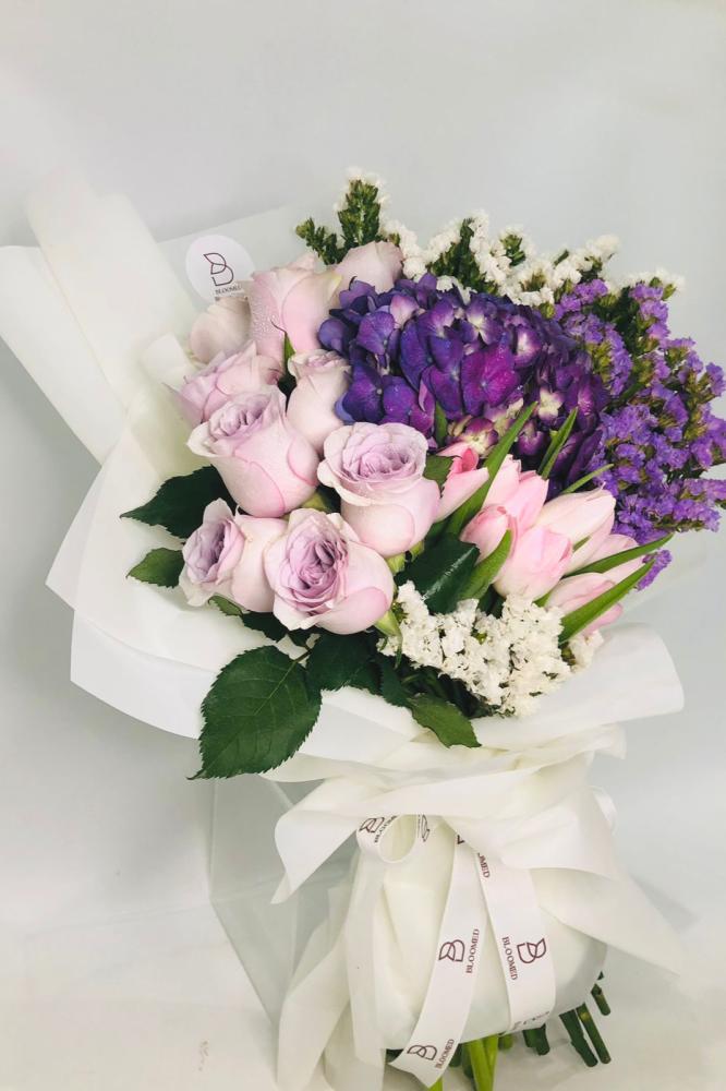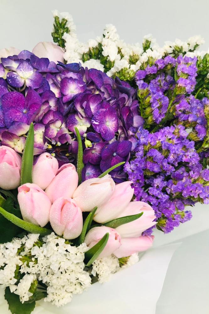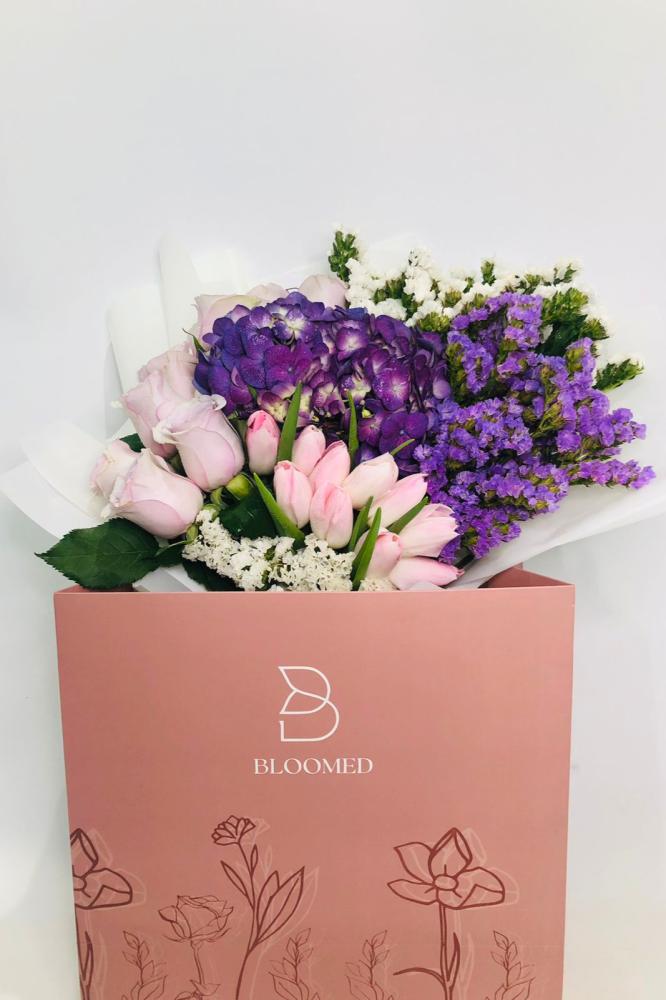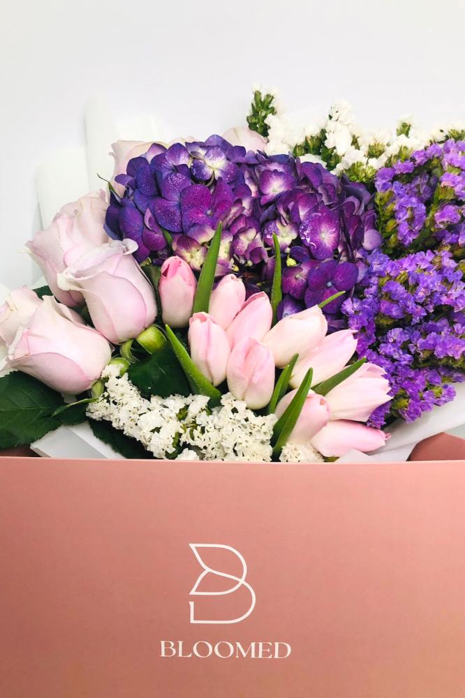 باقة التوليب الوردي مع ورد الروز والهايدرنجا والستاتيس في صندوق بلومد المميز 💐