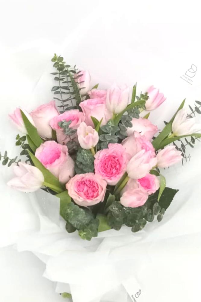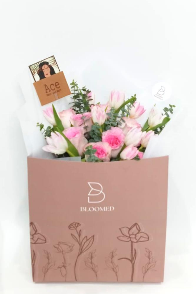باقة الجوري مع ورد التوليب في صندوق بلومد المميز 💐هدية رائعة لأحبابك( الارتفاع مع الورد 45 سم العرض 30 سم )