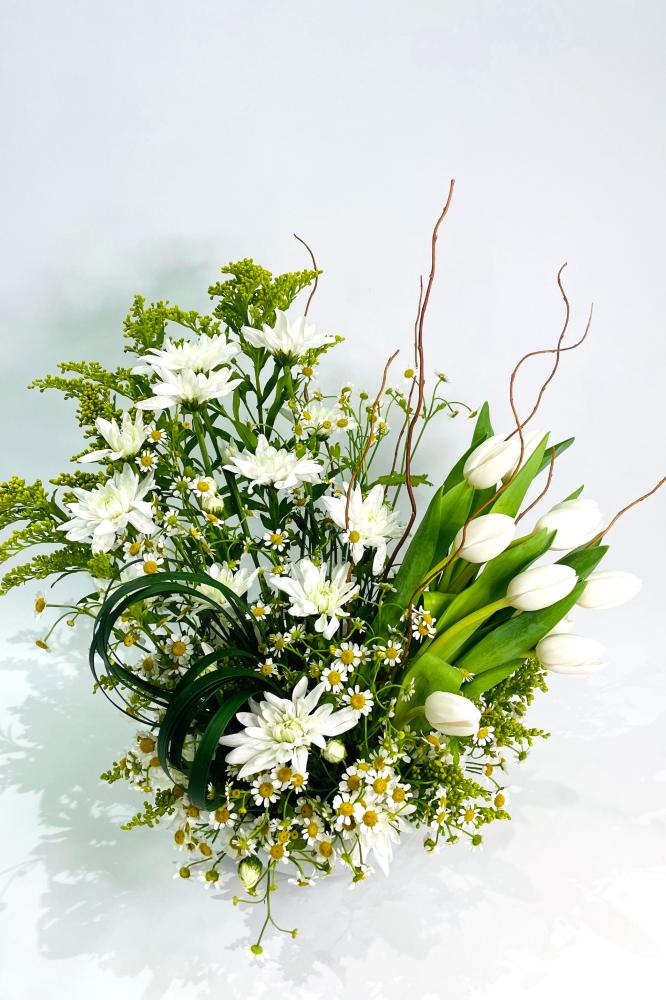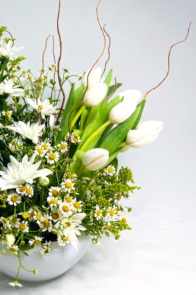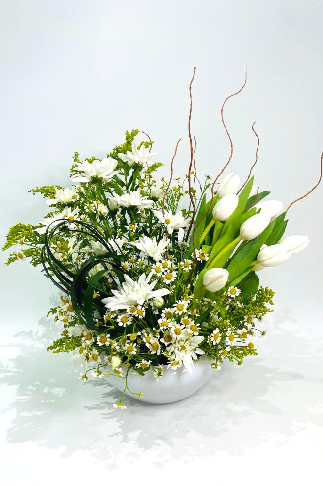 فازة ورد الدايزي مع لمسات انيقه من ورد الكريز والتوليب الابيض 🍀