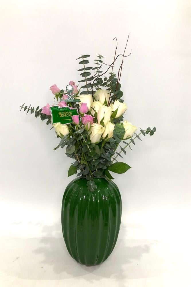 فازة انيقة باللون الاخضر مع لمسات انيقه من الروز والبيبي روز 🍀