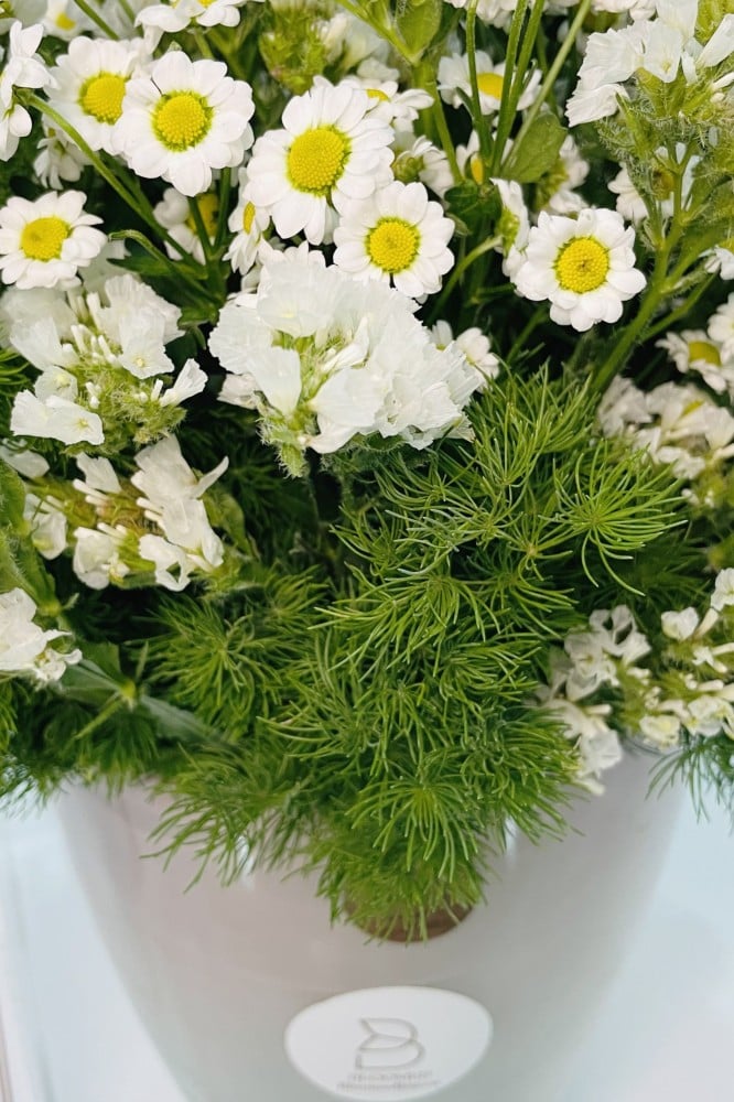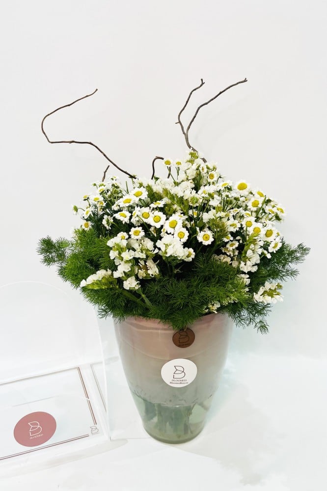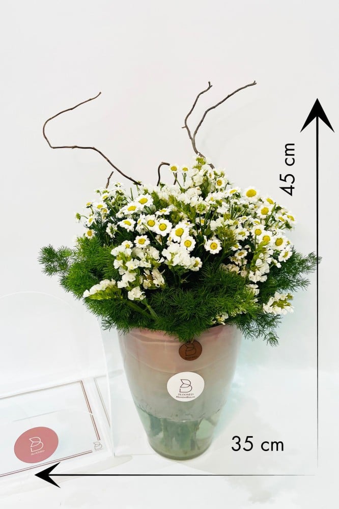 فازة الولاء بورود الأقحوان البيضاء هدية انيقة وتحمل العديد من المشاعر الدافئة 🌼( الارتفاع مع الورد 45 سم العرض 35 سم )